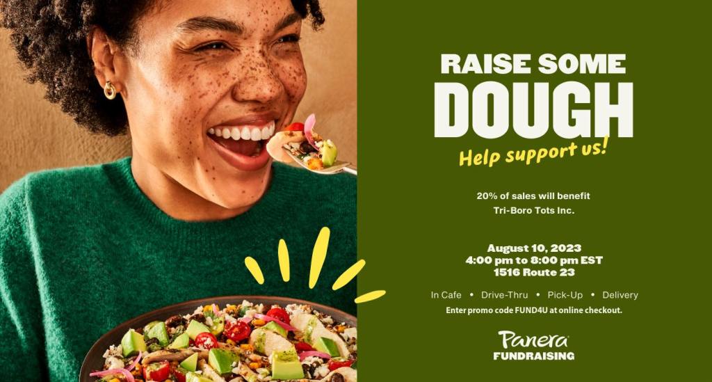 Tri-Boro Tots is fundraising with Panera Bread! Join us on August 10th from 4:00 PM to 8:00 PM at the Butler Panera Bread location (1516 Route 23) or place an order using code FUND4U. 20% of sales will benefits Tri-Boro Tots!