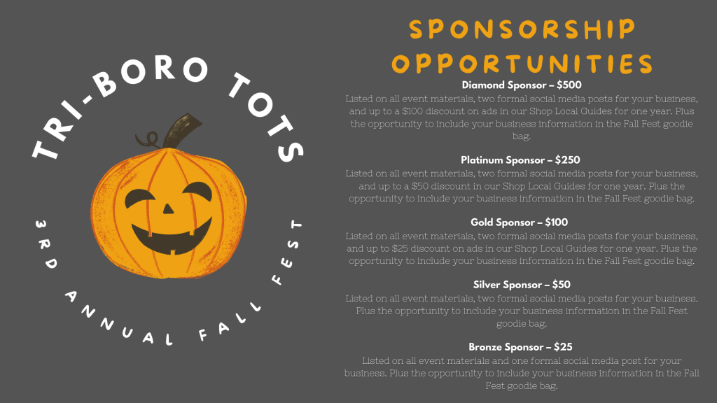Proceeds from our sponsorships go right back into our community-building mission. Additionally, Parenting Network families are historically loyal to the businesses that support our guides. With dozens of families currently associated with Tri-Boro Tots, the goodwill you will receive supporting our Fall Fest is invaluable.