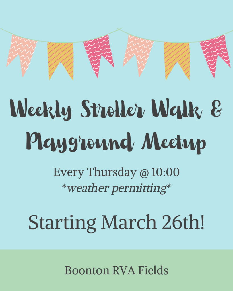 Looking to get out of the house, get some fresh air, and meet other local moms? Come join us for a free, weekly Stroller Walk and Playground Meetup every Thursday starting March 26 at Boonton RVA Field (weather permitting).